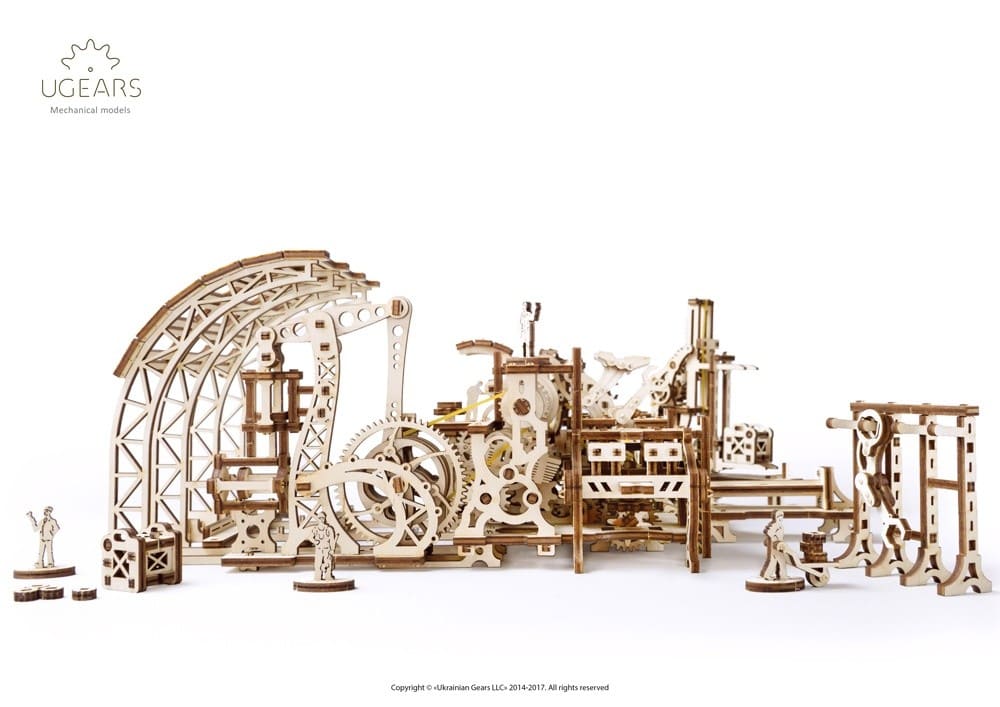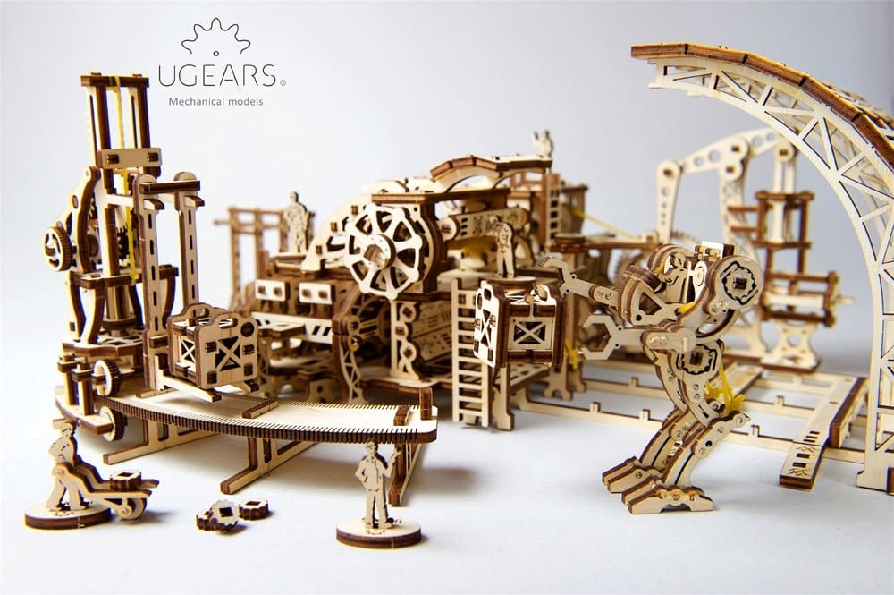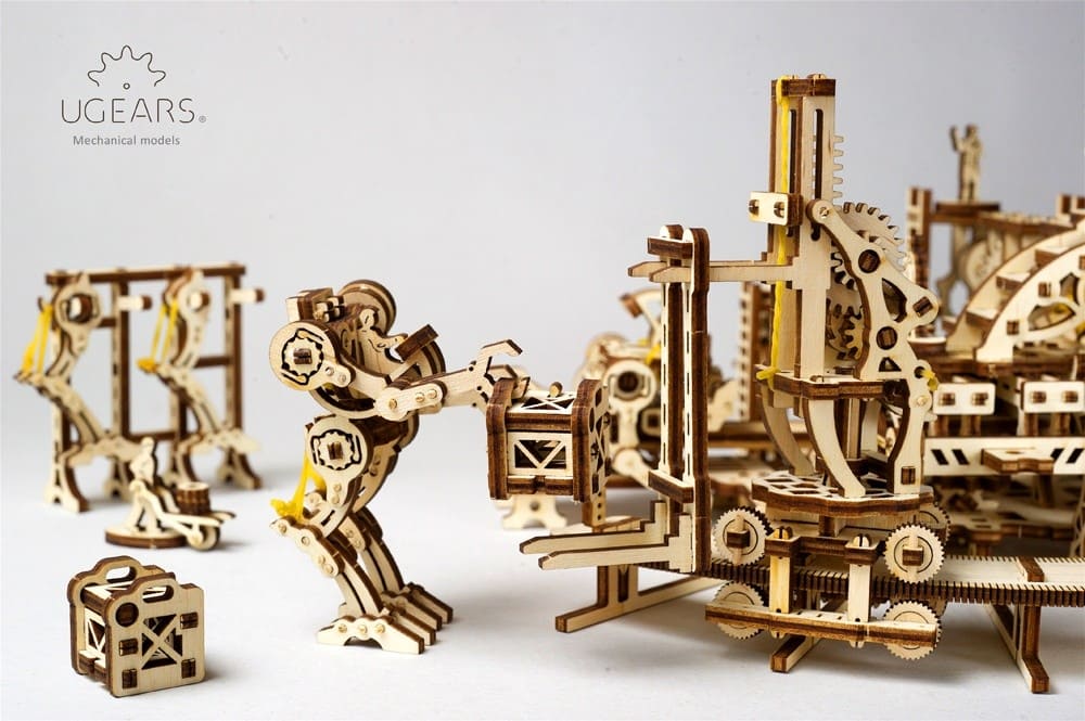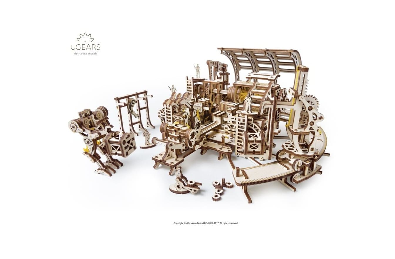Фабрика Роботов, официально известная в Городе под названием «Завод Механических Чудес», представляет собой именно то, что подразумевают оба ее названия: конструктор завода по производству роботов и, несомненно, замечательный образец механической 3D-модели. Ugears предлагает вам создать Фабрику в стиле стимпанк с рабочим конвейером по сборке роботов. Чтобы создать механического помощника, расположите детали робота в соответствующих местах конвейера, заведите модель, нажмите кнопку и – готово! Полностью автоматизированная линия сборки произвела для вас деревянного робота, готового помогать в осуществлении ваших самых невероятных идей!