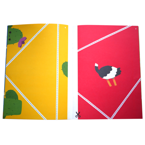 Для облегчения выполнения задания на каждом листе есть заранее прорисованная пунктирная линия, которая обозначает место сгиба. Но, с каждой новой страничкой сложность заданий усложняется. Хотя кого этим напугаешь? Упорные малыши справятся с любой задачей.